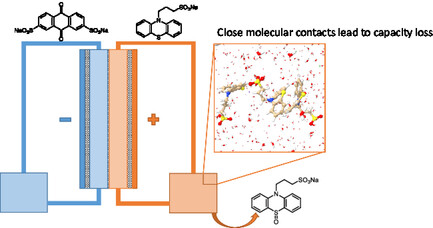 Dans ce contexte, nous avons entrepris la synthèse de nouveaux médiateurs couvrant une large gamme de potentiels redox. L’accent a été mis sur les médiateurs pour l’électrode positive, encore peu étudiés, notamment ceux des familles des phénothiazines et des ferrocènes. Certains dérivés de phénothiazine portant des groupements solubilisants présentent des propriétés de solubilité et de potentiel redox intéressantes pour l’application. Toutefois, ces composés montrent une perte rapide de capacité en batterie, liée à un mécanisme de dégradation impliquant une réaction de dismutation (Figure). Ces résultats ont fait l’objet d’une publication dans Chemistry Europe.