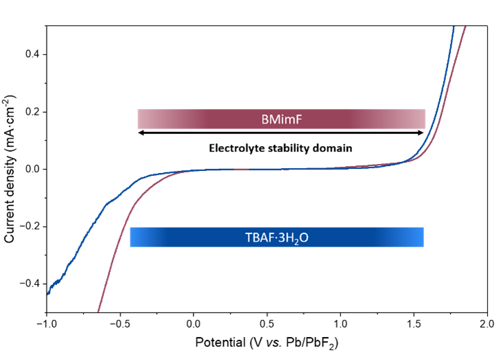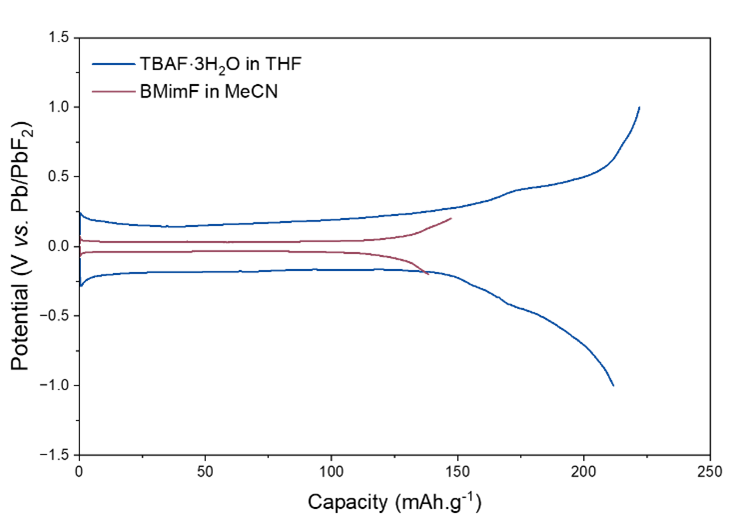 Les mesures électrochimiques révèlent une conductivité ionique élevée (15,3 mS·cm-1 à température ambiante) et une fenêtre de stabilité électrochimique comprise entre 0,37 et 1,59 V vs. Pb/PbF2, comparable à celle de l’électrolyte référence 1M TBAF dans THF. Testé dans une cellule symétrique Pb/PbF2, cet électrolyte permet un cyclage réversible avec une très faible surtension initiale de 75 mV à 6 mA·g-1, valeur parmi les plus faibles rapportées pour ce système. Associé à une électrode positive de BiF3, il permet également des réactions de conversion réversibles avec une surtension modérée (≈160 mV), confirmant l’efficacité du transport des ions fluorure.
