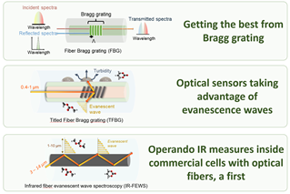 Spectroscopie infrarouge operando par fibre optique — Vers le « Lab on the Fiber ». En combinant une fibre chalcogénure (TAS) revêtue d’oxyde d’indium-étain (ITO), un capteur optique fonctionnant également comme électrode de travail a été développé. L’insertion/désinsertion réversible du sodium dans le bleu de Prusse a été suivie directement sur la fibre par spectroscopie IR-FEWS, ouvrant la voie au concept de « laboratoire sur fibre ».