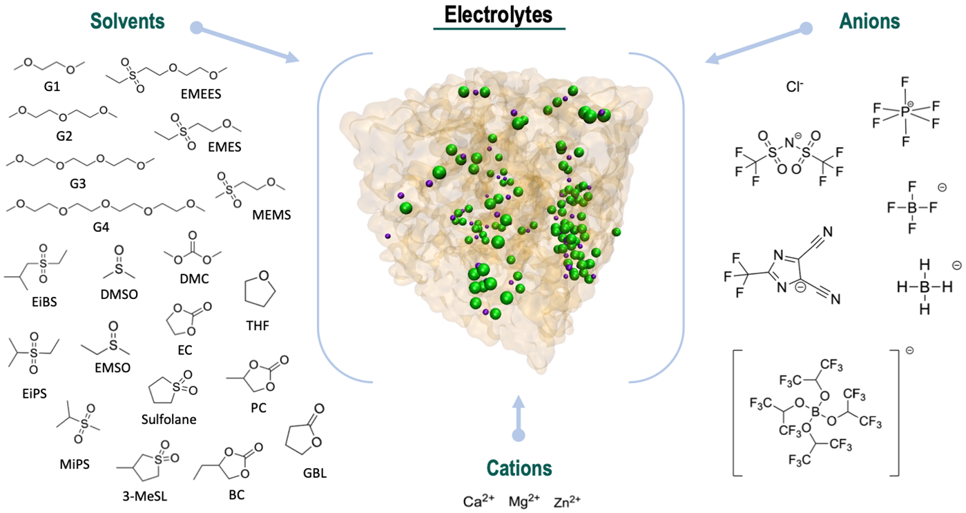 Après une phase de mise au point des modèles d’interaction moléculaire (champs de force) polarisables pour les cations divalents et pour des constituants d’électrolyte, un ensemble de descripteurs des ions la phase électrolyte est en production par des calculs haute performance. Ces descripteurs incluent des grandeurs thermodynamiques, structurales (sphères de solvatation, spéciation), de transport (diffusion, conductivité) et diélectriques. Plusieurs dizaines de composés sont étudiés, incluant des éthers (glymes), sulfones, carbonates, et aussi différents anions faiblement coordinants. Des tendances sur des relations entre la structure moléculaire et les propriétés commencent à se révéler.
