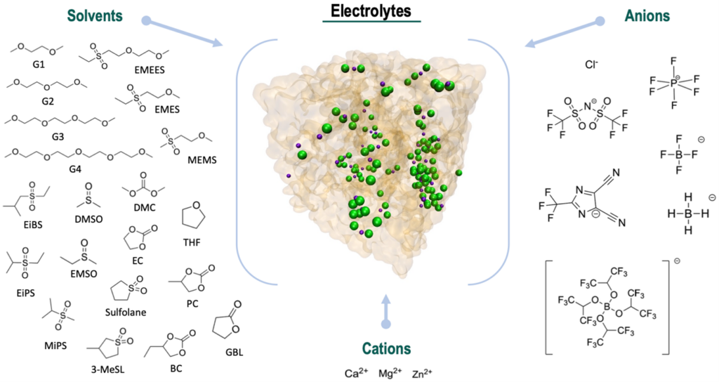 Le projet LEGEND s’est fixé pour objectif de concevoir des électrolytes pour des batteries à base de cations divalents, Ca(II), Mg(II), Zn(II), des éléments abondants qui offrent une haute densité d’énergie. Le design rationnel de nouveaux électrolytes performants requiert une meilleure compréhension des mécanismes de solvatation et de transport des ions, et aussi des phénomènes de structuration et déposition aux interfaces d’électrode. Ce projet utilise et développe des méthodes de simulation moléculaire et d’apprentissage automatique pour construire une librairie d’électrolytes à fort potentiel qui seront testés expérimentalement.